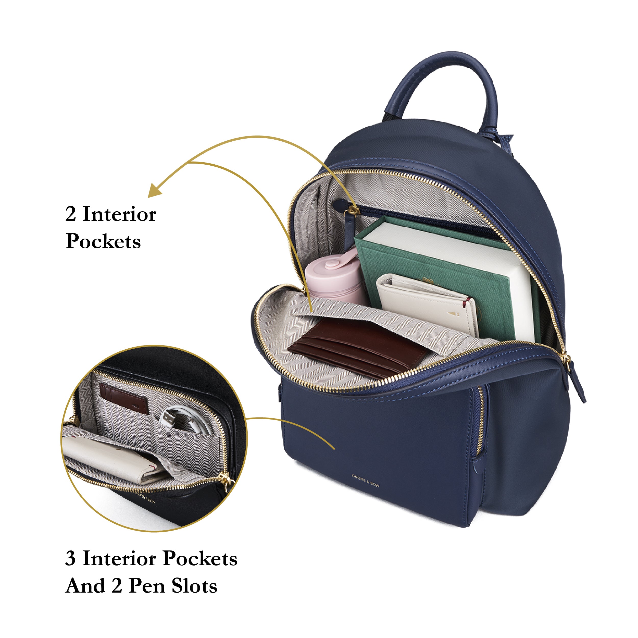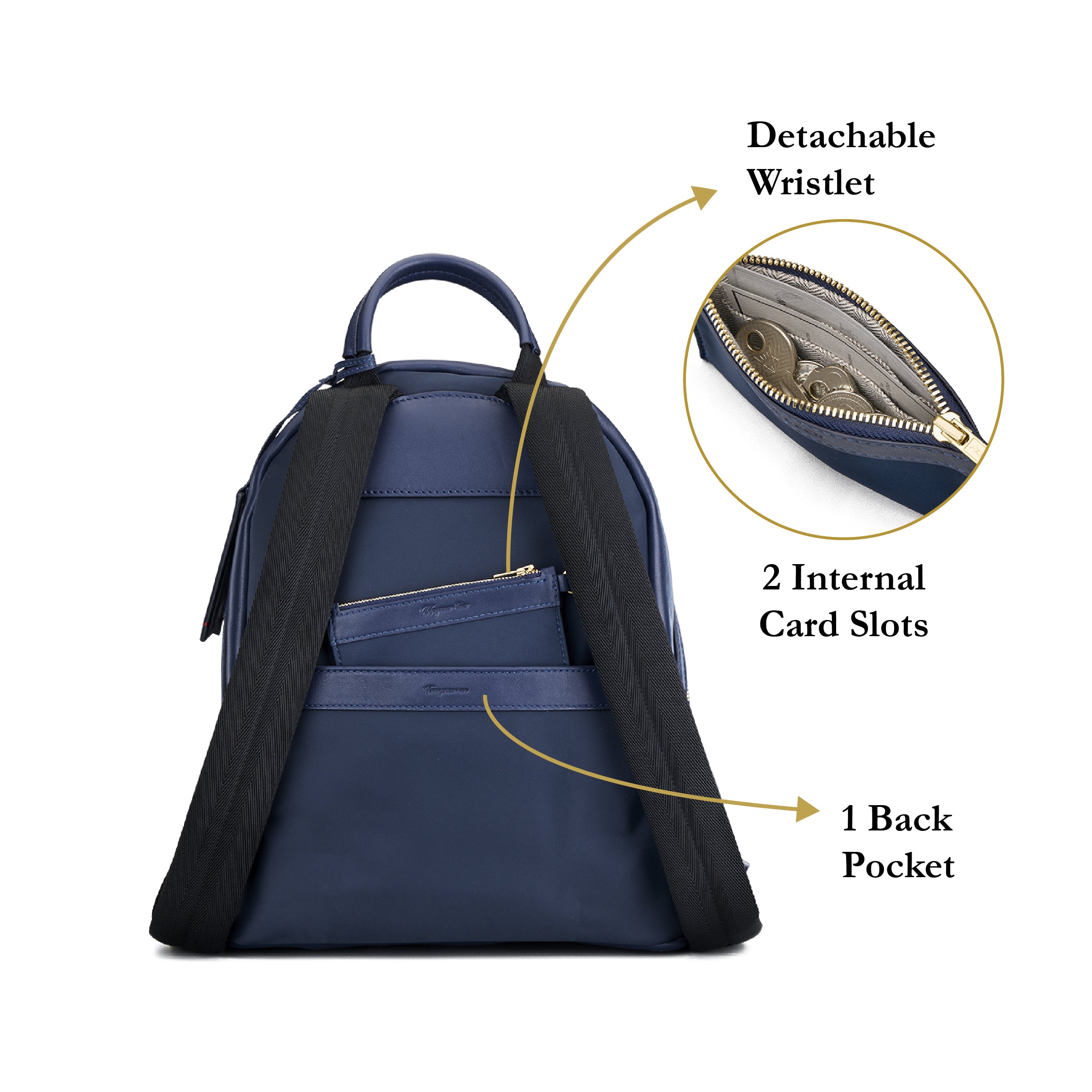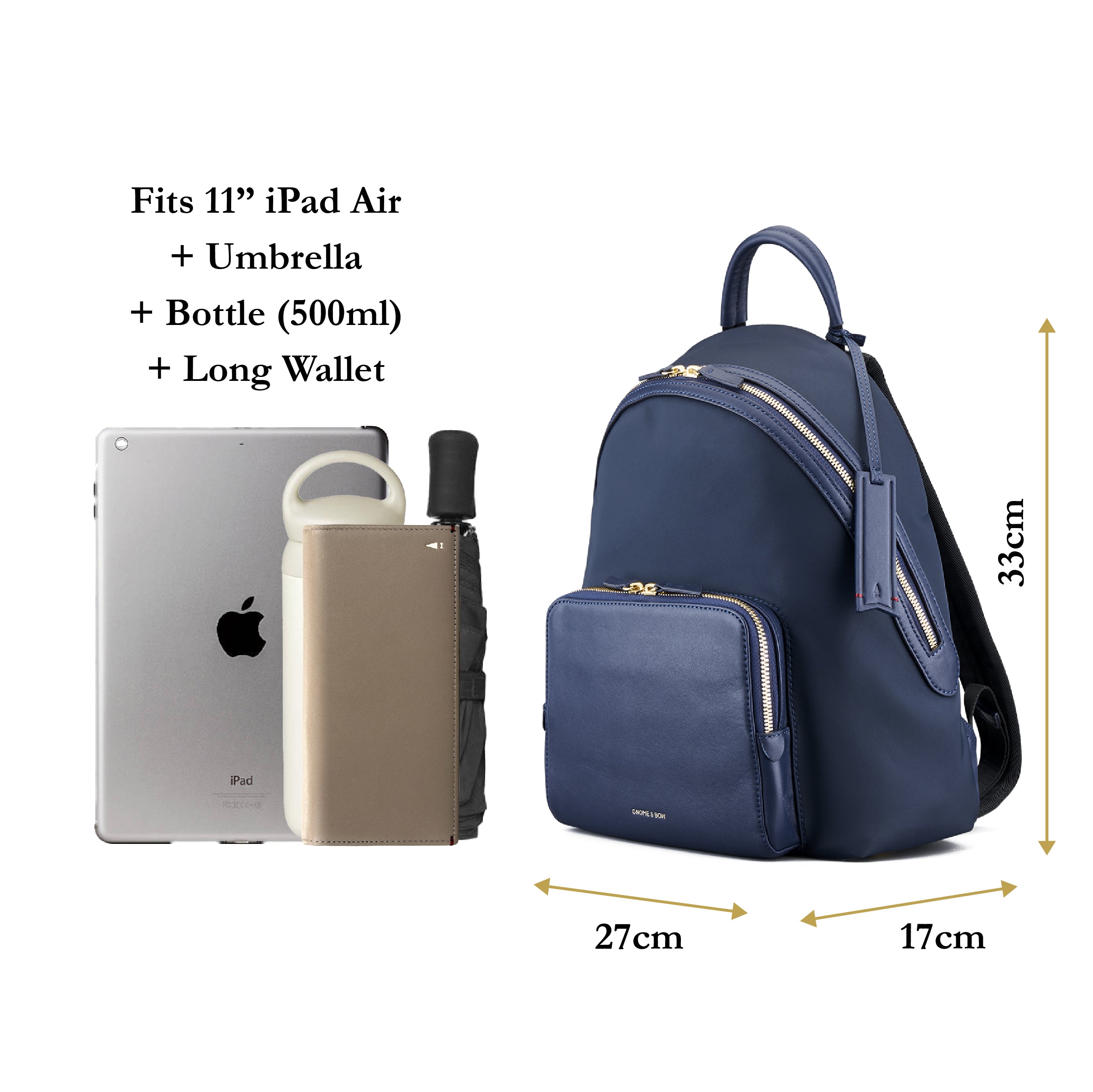 A lightweight, water-resistant travel backpack for the active urbanite seeking style, function and hands-free convenience. A wide curved opening gives quick access to the spacious interior that holds a 11" iPad Air Tablet, umbrella, bottle and long wallet with multiple pockets to organise your phone, cards and smaller items. Easy to maintain and accented with full grain genuine leather for long lasting durability and a refined look.