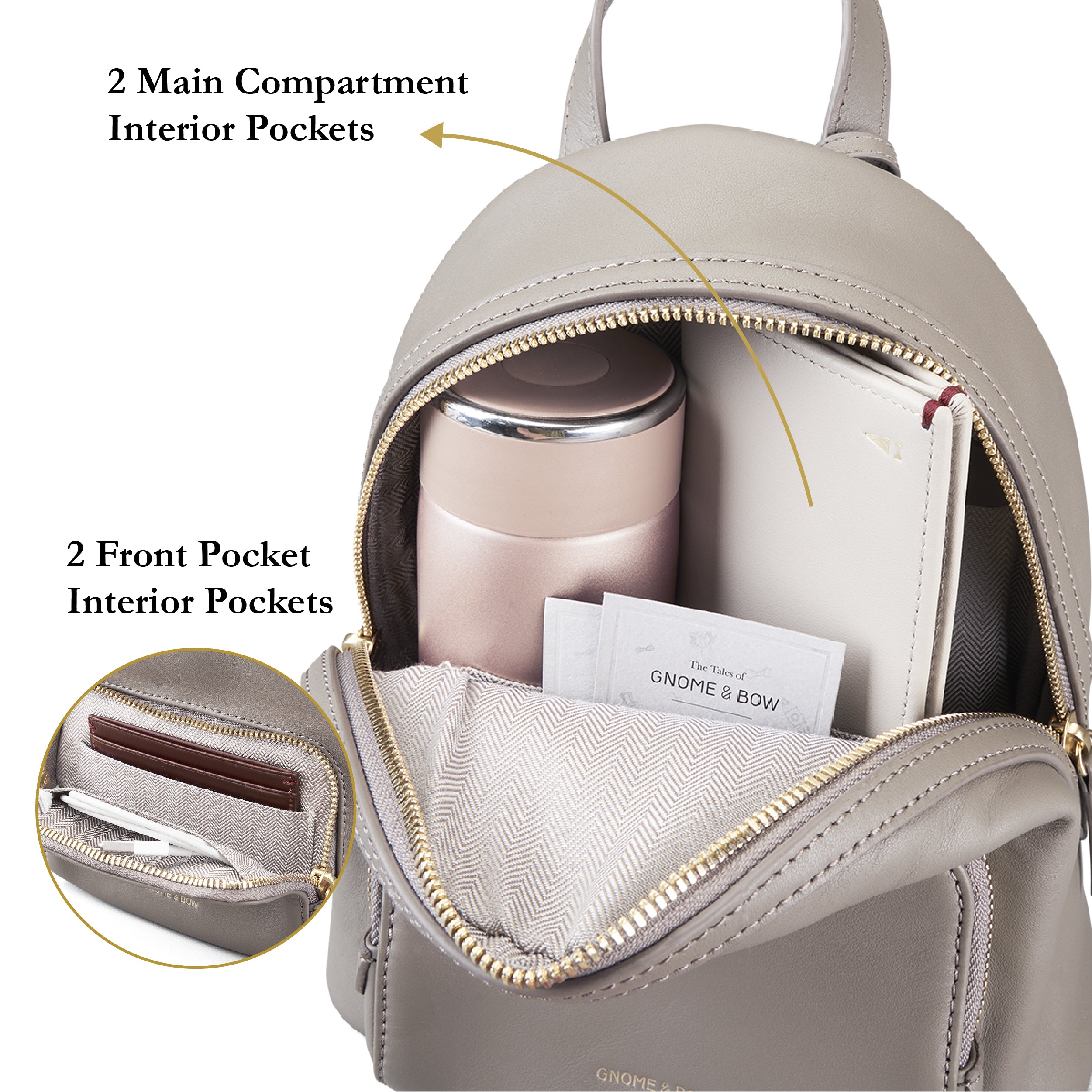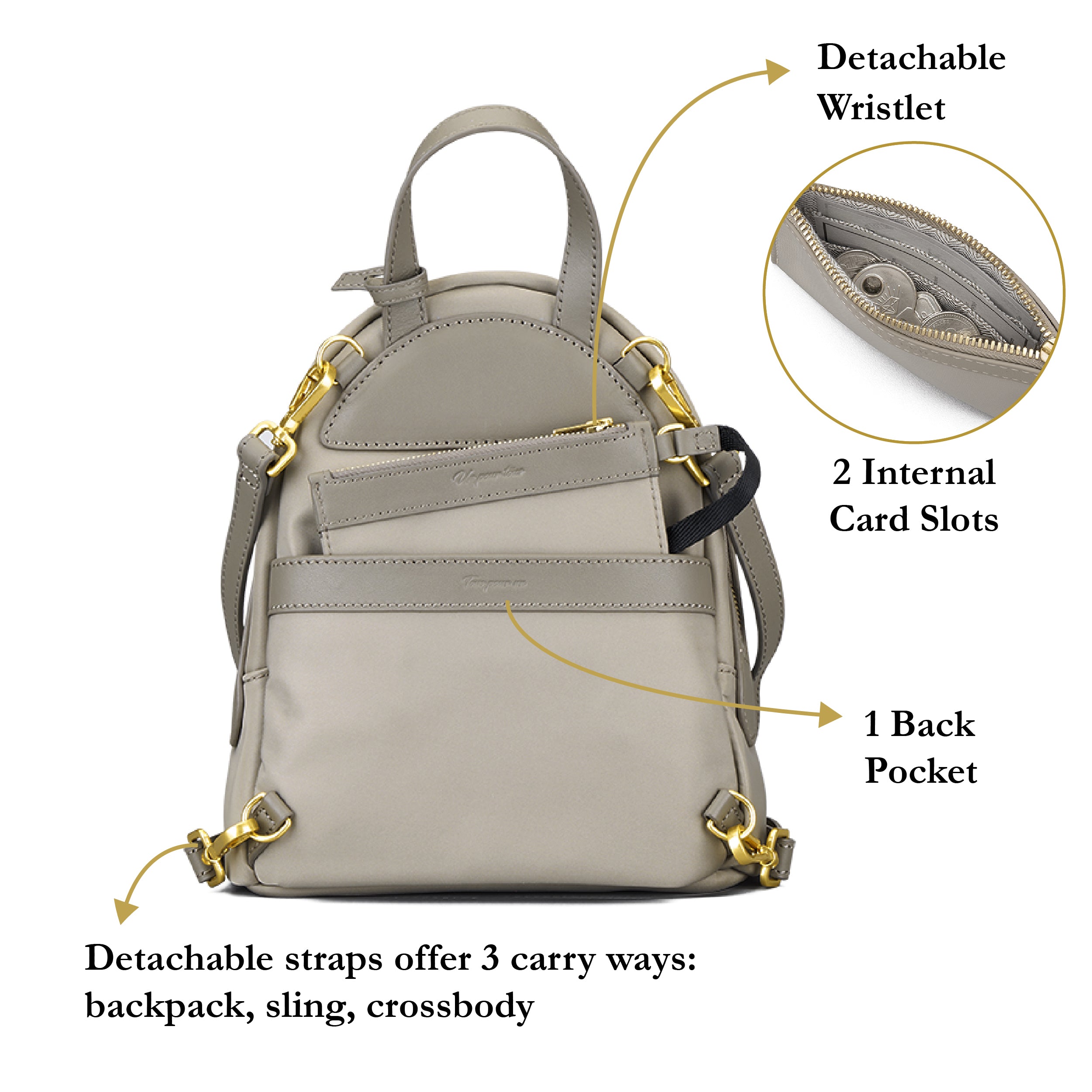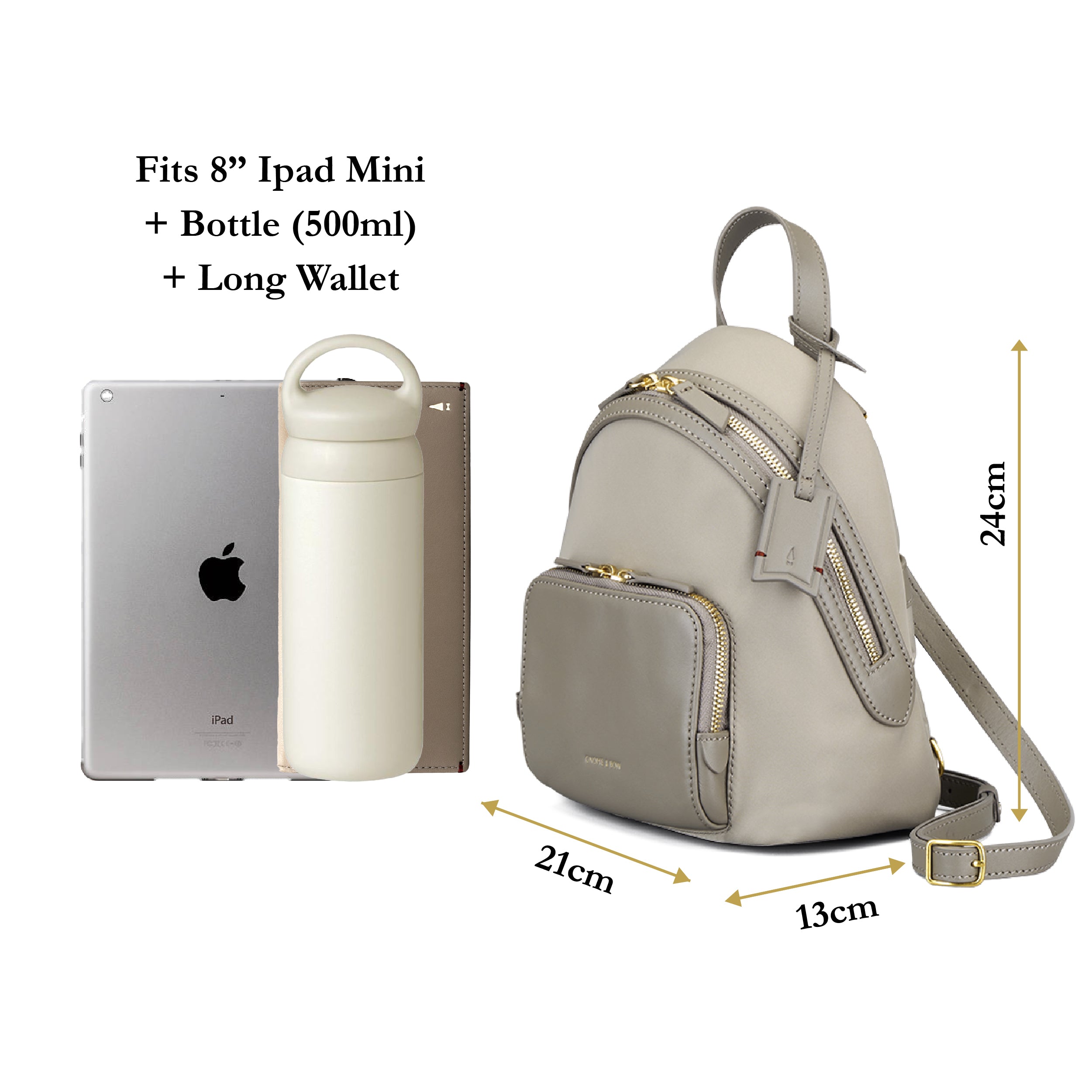 A lightweight, water-resistant compact convertible 3-way crossbody backpack for the stylish urbanite seeking hands-free travel convenience. A wide curved opening gives quick access to the spacious interior that holds a 8" Ipad Mini Tablet bottle, long wallet, phone with multiple pockets to organise your cards and smaller items. Easy to maintain and accented with full grain genuine leather for long lasting durability and a refined look.