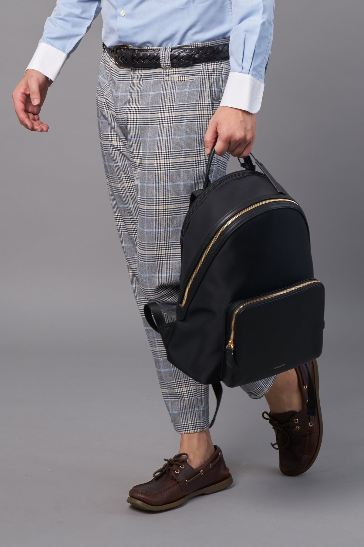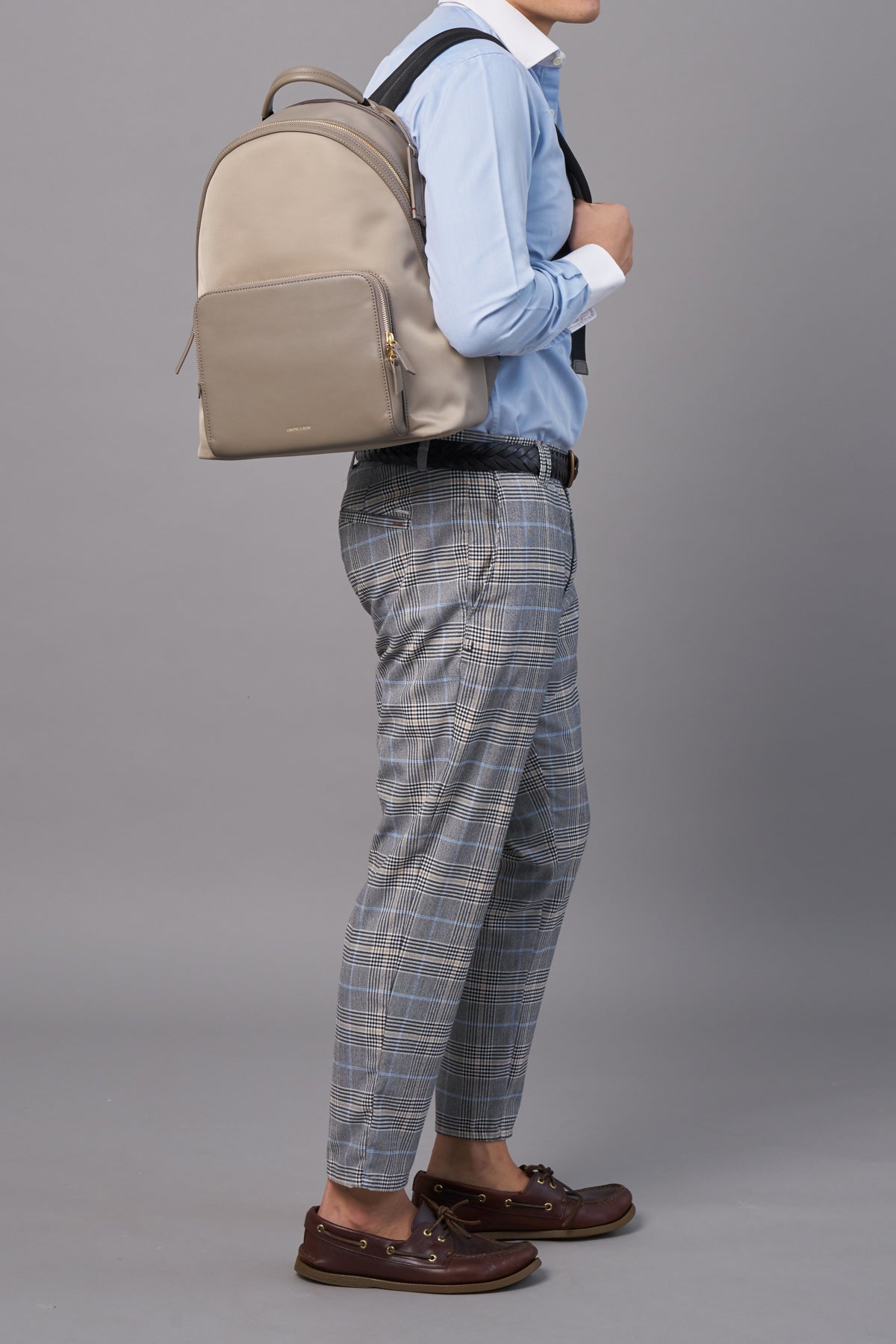 A premium leather work and travel 13" / 14 " laptop backpack for the active urbanite seeking style, function and hands-free convenience with a trolley sleeve luggage slot. A wide curved opening gives quick access to a spacious interior that holds all your shoes, documents, bottle and umbrella with multiple pockets to organise your phone, pens, wallet and passport. Crafted in full grain genuine leather for long lasting durability and combined with lightweight water resistant nylon for easy maintenance.