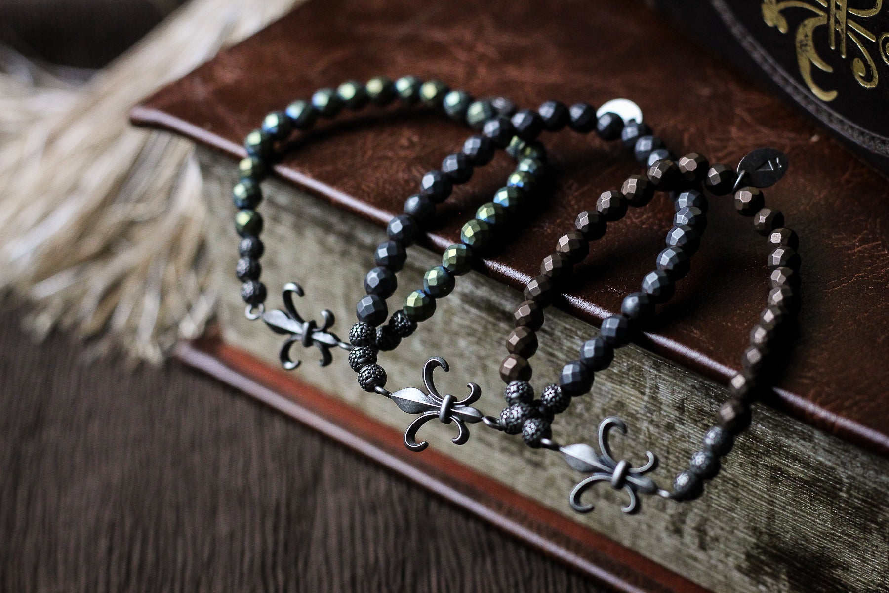 This tuneful and opulent bracelet pairing of an antique silver fleur-de-lis with the soft lustre of multi-faceted hematite beads is a nod to ancient opulence and modern wearability. A mark of royalty, the fleur-de-lis evokes a sense of romanticism inspired by The Three Musketeers and has stood the test of time for centuries through kingdoms across the Europe. Thick elastic band for durable and easy wearing. Stack them with other bracelets for a layered look.
