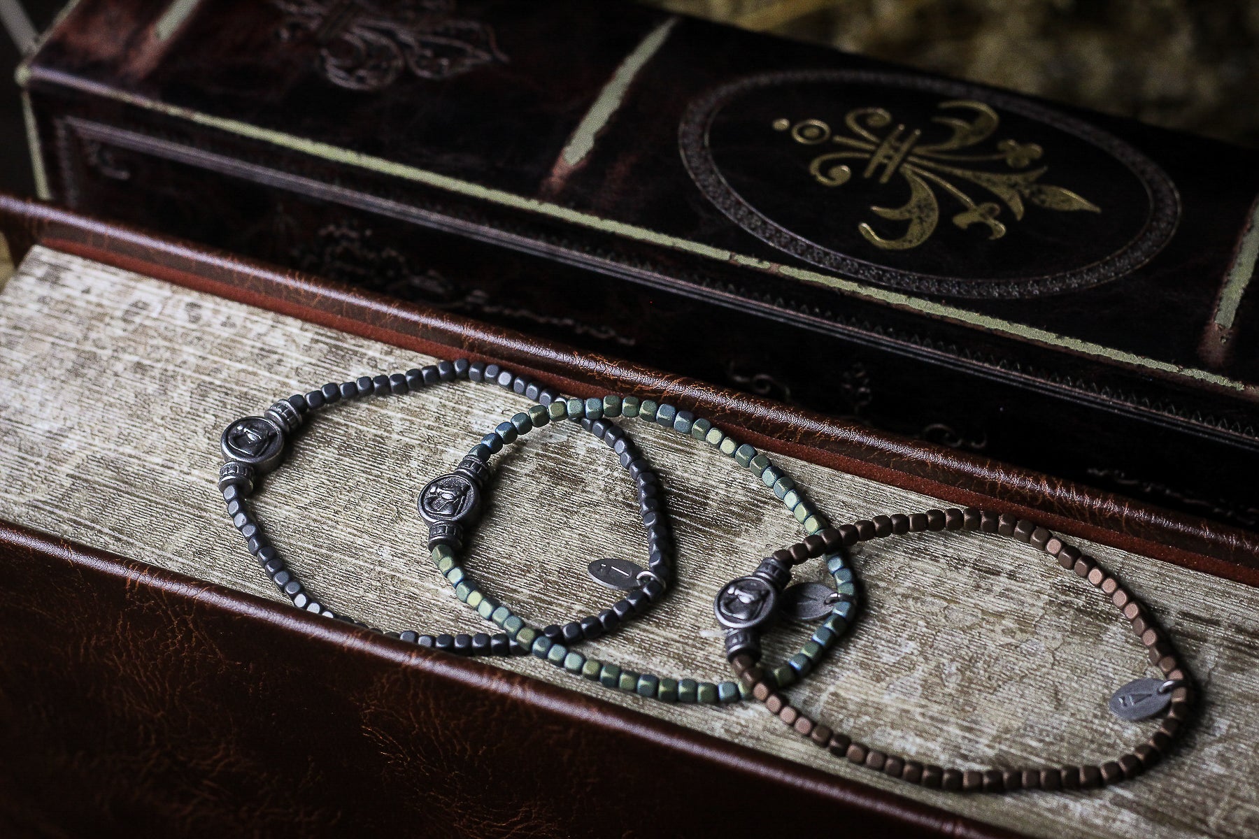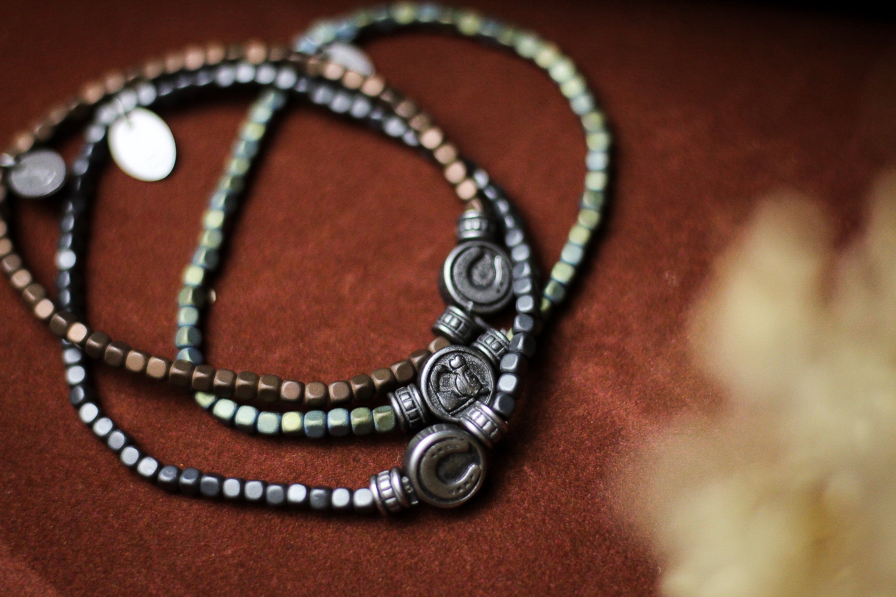 A exquisite beads bracelet made of hematite cubes and stainless steel charm inspired by The Three Musketeers. The horse, powerfully grounded yet freely moving, has proven to be significantly integral during medieval times while their shoes became widely known to be a symbol of good luck. The harmonious coupling of this two-sided antique silver charm with the organic form of hematite cubes makes for a beads bracelet that's effortlessly stylish and versatile. Reinforced elastic band for durable and easy wearing.